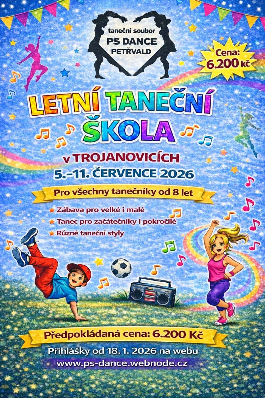 11.-14.02.2026 taneční soustředění Trojanovice - pro skupiny DĚTI 1 a DĚTI 2 - odjezd od tělocvičny ZŠ v 15.15 hod. (parkoviště COOP)26.02.-01.03.2026 taneční soustředění Trojanovice - pro skupiny JUNIOŘI a HLAVNÍ - odjezd od tělocvičny ZŠ v 15.15 hod. (parkoviště COOP)